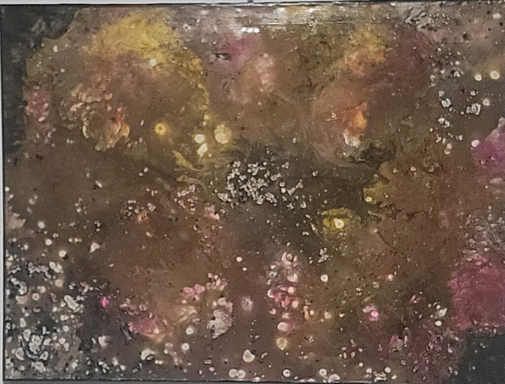 “Cosmos intérieur” invite le spectateur à plonger dans une matière organique et cosmique à la fois. Entre brumes célestes et textures minérales, la toile déploie une palette de bruns profonds, d’ocres lumineux et de nuances rosées. Des points de lumière jaillissent ici et là, semblables à des étoiles, conférant à l’ensemble une atmosphère à la fois mystique et introspective.