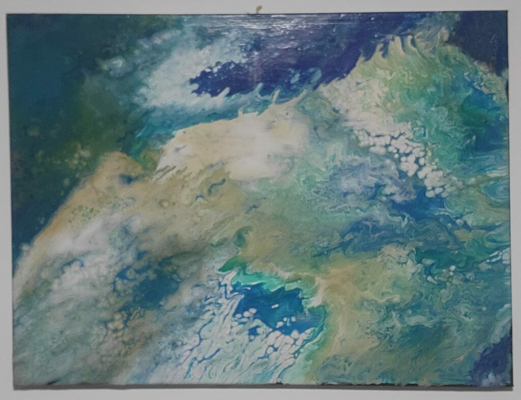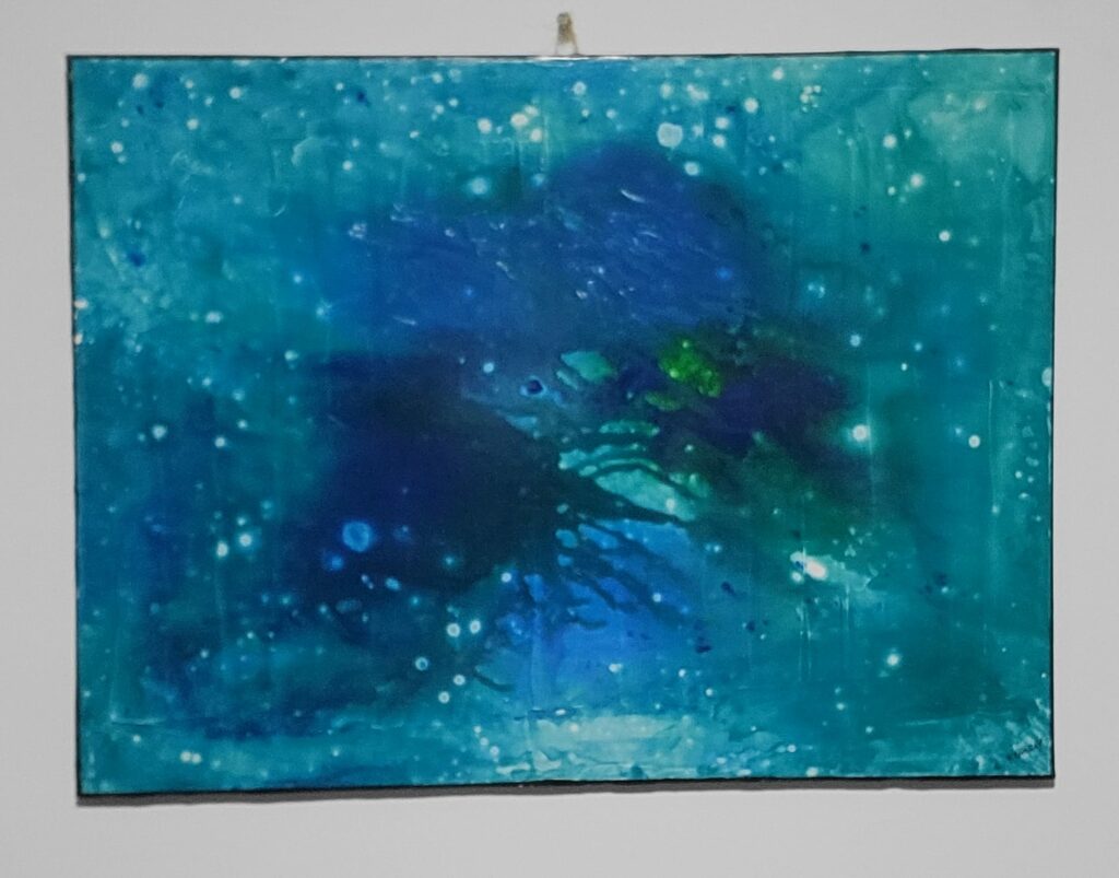 “Abysses célestes” est une plongée dans la profondeur du bleu, entre mer et cosmos. Les nuances turquoise, indigo et vert émeraude se fondent en un mouvement fluide, créant une impression de suspension, comme si l’on observait un univers aquatique en apesanteur.