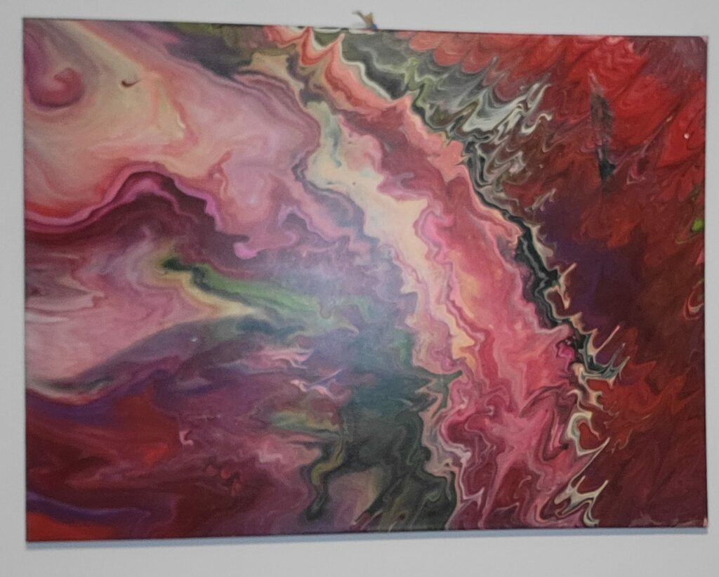 “Fusion écarlate” explore la puissance des émotions à travers un tourbillon de teintes rouges, roses et pourpres. Les couleurs semblent se mêler et s’affronter, formant une vague de mouvement et d’énergie presque volcanique. Des nuances sombres et des éclats lumineux se répondent, évoquant la passion, la transformation et la vitalité.