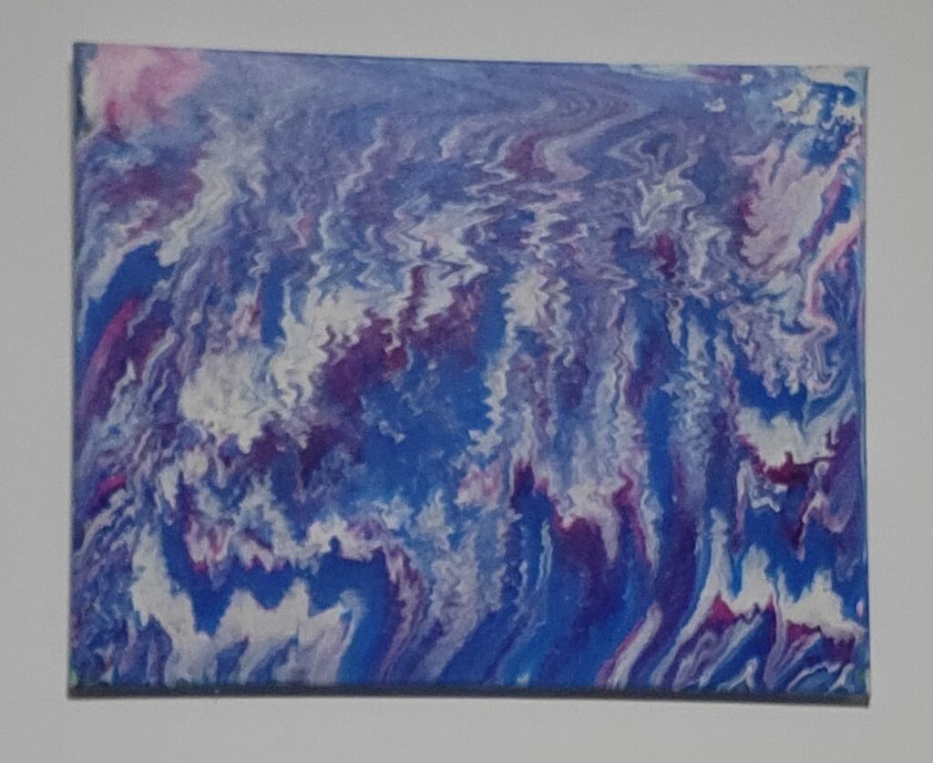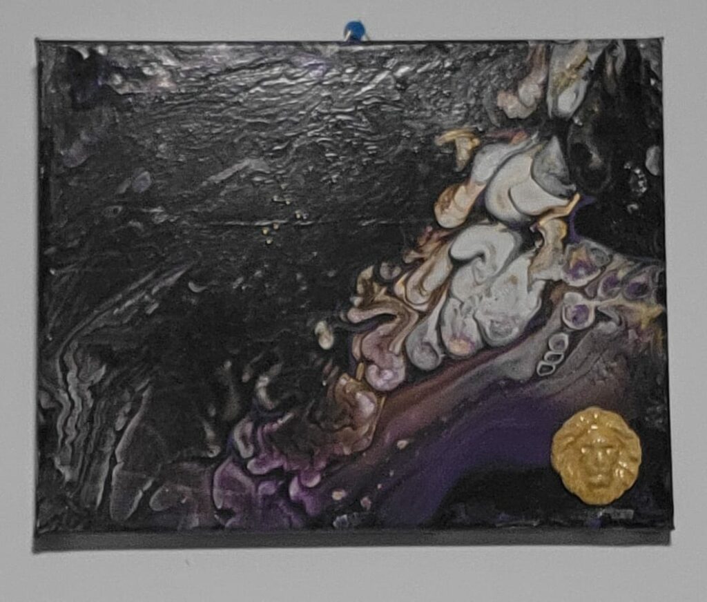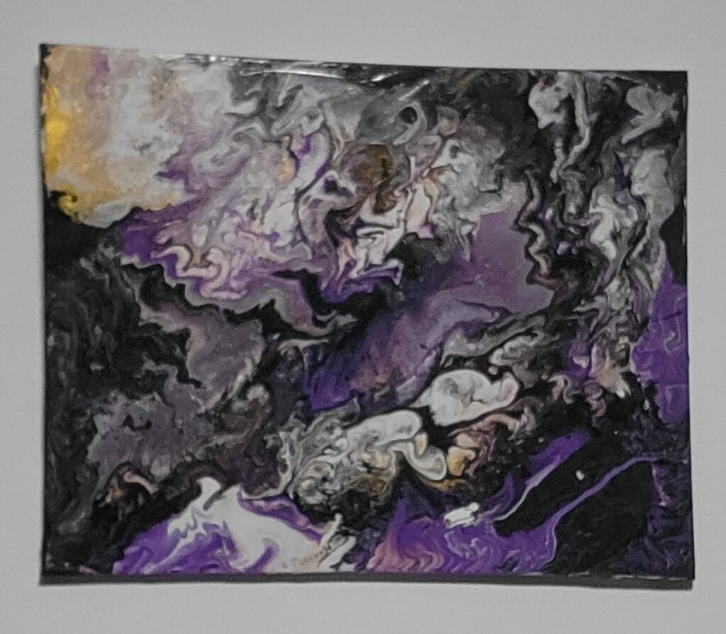 “Éclipse d’améthyste” explore la rencontre entre ombre et lumière dans une danse chromatique empreinte de mystère. Les nuances de violet profond, de noir velouté et de blanc nacré se mêlent en volutes hypnotiques, évoquant les mouvements d’un ciel en tempête ou la surface d’une planète lointaine.