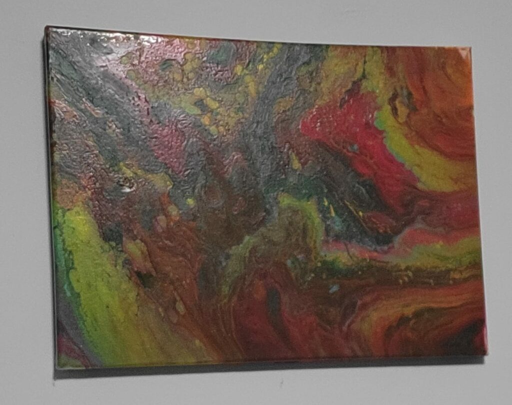“Éruption solaire” est une œuvre vibrante qui semble capturer un instant d’énergie pure. Les rouges flamboyants, les jaunes intenses et les éclats de vert se mêlent en une composition à la fois puissante et organique, rappelant le mouvement d’une lave en fusion ou d’une explosion cosmique.