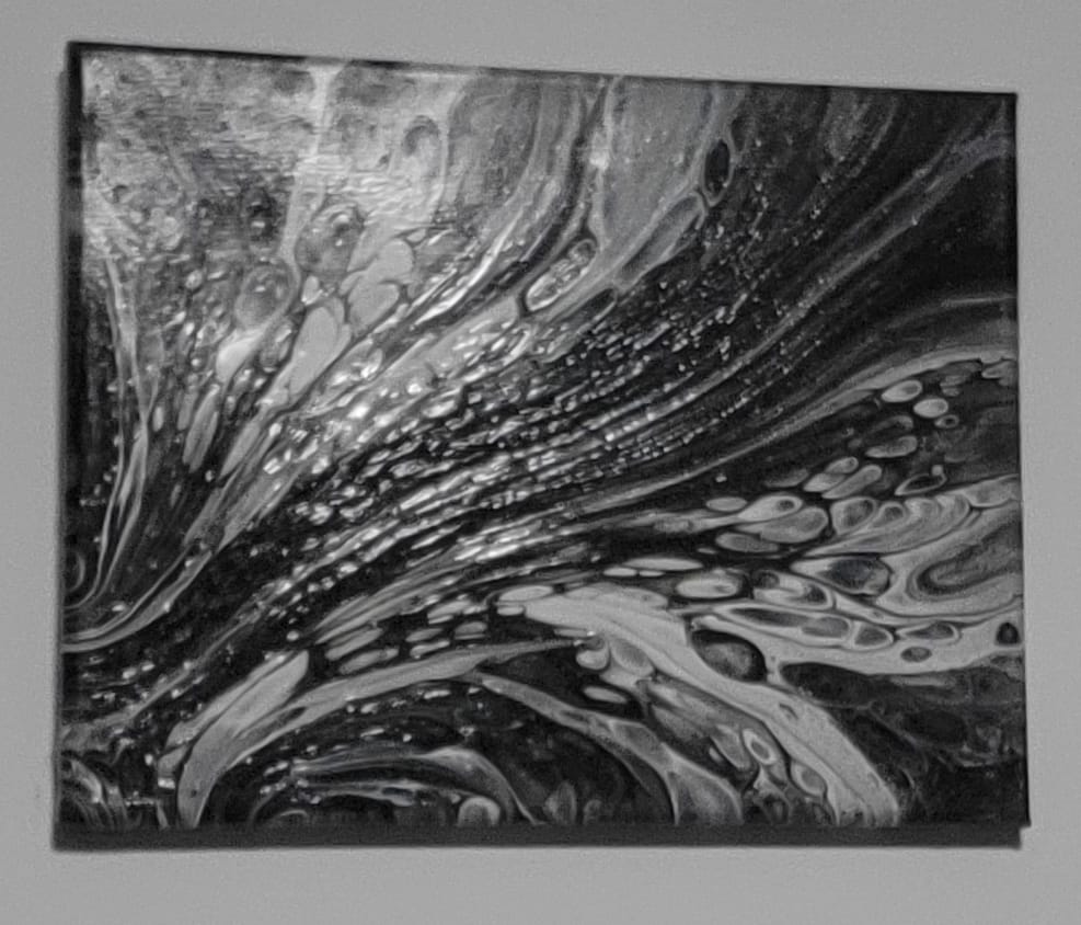 “Onde de lumière” explore la dualité entre obscurité et clarté à travers une composition en mouvement. Les teintes argentées et les nuances de gris s’enlacent dans un flux organique rappelant une vague, un souffle d’énergie ou un passage de lumière dans la matière.