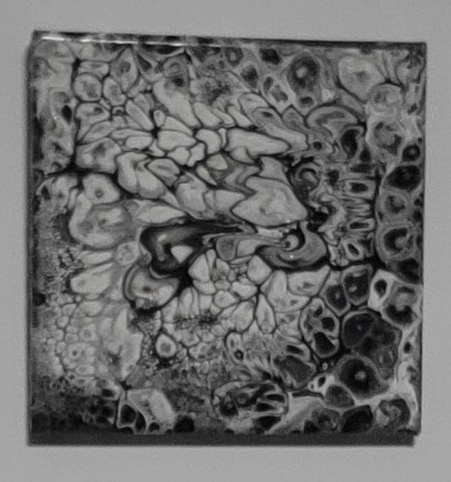 “Cellules d’argent” explore la beauté organique du vivant à travers un réseau de formes évoquant des structures minérales ou biologiques. Le jeu de contrastes entre les gris, noirs et blancs crée une texture presque tridimensionnelle, où chaque cellule semble vibrer d’une énergie propre.