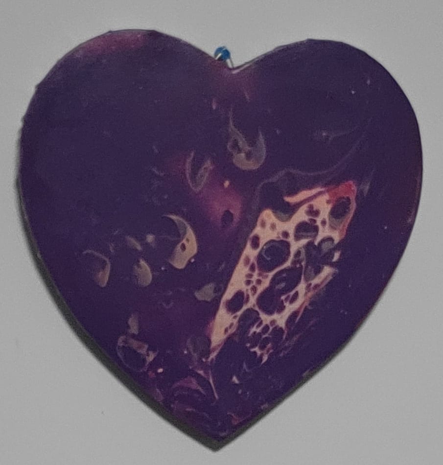 Technique : Peinture fluide acrylique sur support en forme de cœur, finitions vernies brillantes
